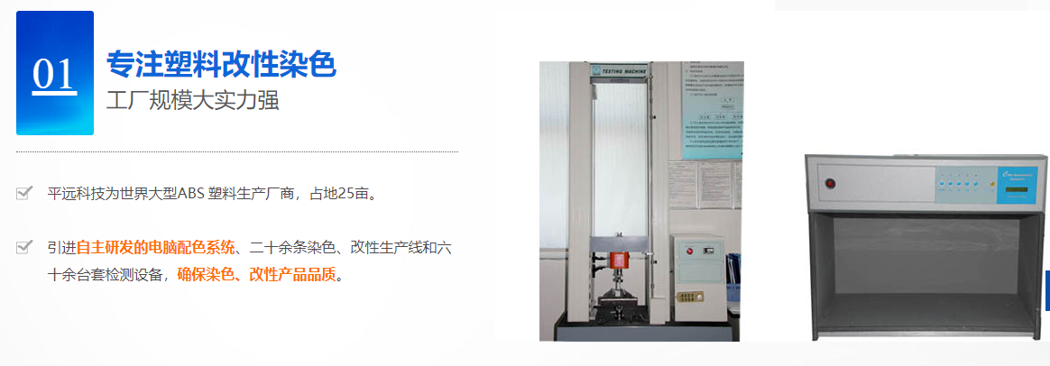 公司具有完善的质量管控系统,采用奇美集团自主研发的先进电脑配色系统,配色速度快,批次色差小、颜色稳定,易于生产加工,为客户降低生产成本;根据客户不同需求,提供一对一的定制化服务,现场提供技术支持,为客户解决问题,所做产品均满足Rohs、REACH等欧盟对有害物质管控的要求,满足出口要求,满足欧盟食品接触级ABS可为客户提供各种检测报告。公司通过了ISO9001质量管理体系、ISO14001环境管理体系和ISO45001职业健康安全体系,全球回收标准GRS认证。