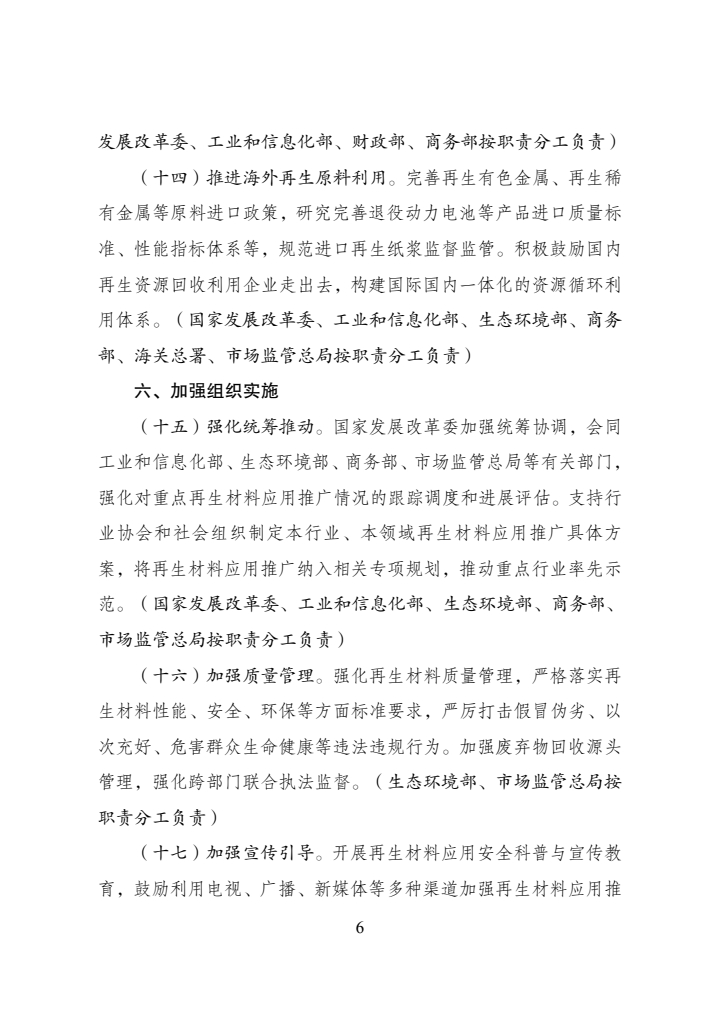 为全面贯彻党的二十大和二十届历次全会精神,认真落实党中央、国务院决策部署,加强再生材料应用推广,完善废弃物循环利用体系,促进循环经济发展,国家发展改革委、工业和信息化部、财政部、生态环境部、商务部、海关总署、市场监管总局等部门制定了《再生材料应用推广行动方案》。现印发给你们,请认真抓好落实。